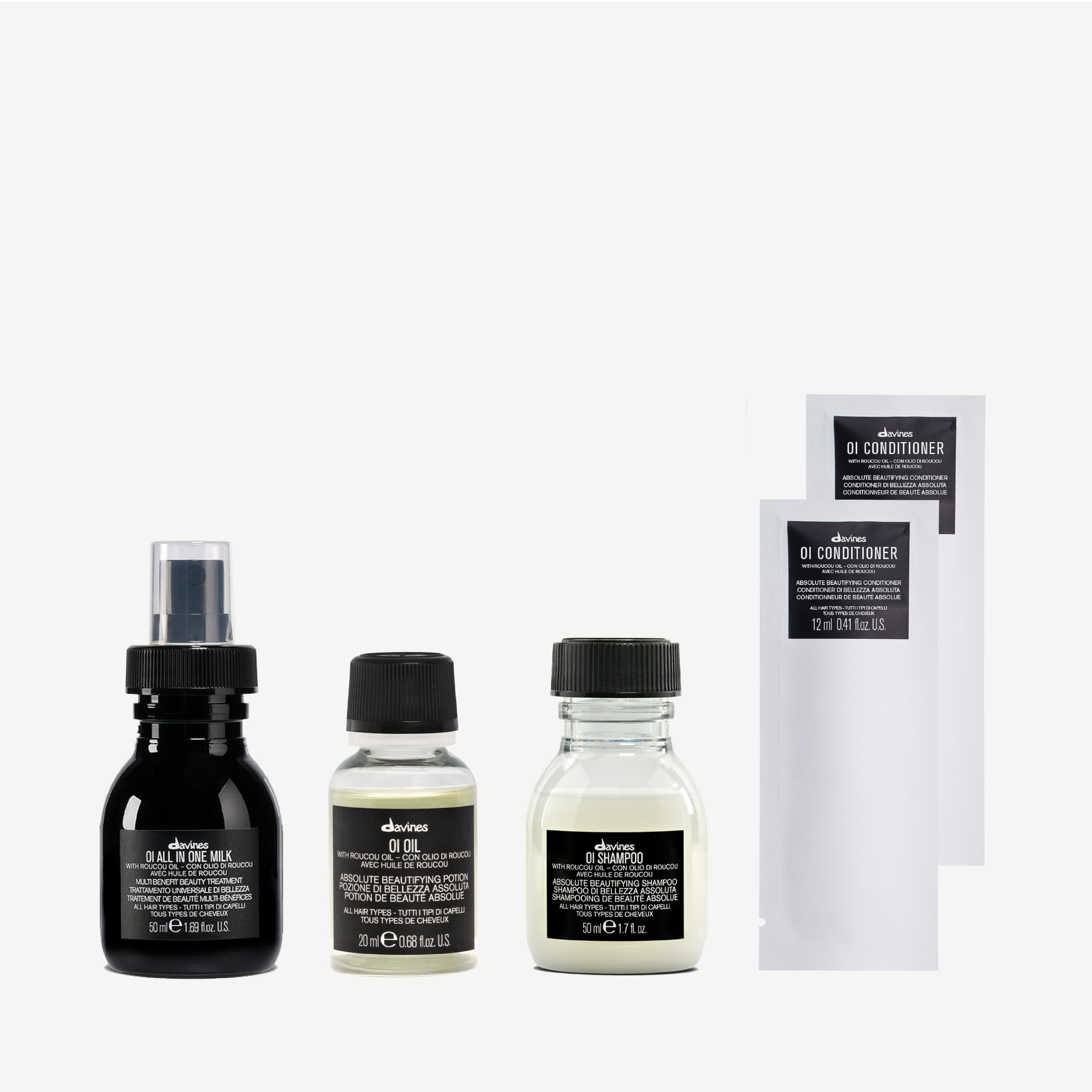 OI SHAMPOO SACHET ECOMMERCE1 BUSTINA SHAMPOO: AQUA / WATER / EAU, SODIUM LAUROYL METHYL ISETHIONATE, DISODIUM LAURETH SULFOSUCCINATE, SODIUM LAUROYL SARCOSINATE, COCAMIDOPROPYL BETAINE, SODIUM LAURYL SULFOACETATE, SODIUM METHYL 2-SULFOLAURATE, PANTHENOL, PARFUM / FRAGRANCE, SODIUM METHYL ISETHIONATE, BENZYL ALCOHOL, ACRYLATES/C10-30 ALKYL ACRYLATE CROSSPOLYMER, LAURIC ACID, PPG-26-BUTETH-26, COCO-GLUCOSIDE, PHENETHYL BENZOATE, GLYCERYL OLEATE, PEG-40 HYDROGENATED CASTOR OIL, SODIUM BENZOATE, GLYCOL DISTEARATE, CITRIC ACID, TRISODIUM ETHYLENEDIAMINE DISUCCINATE, POLYQUATERNIUM-7, DISODIUM 2-SULFOLAURATE, SODIUM HYDROXIDE, SODIUM LAURATE, AMODIMETHICONE, GUAR HYDROXYPROPYLTRIMONIUM CHLORIDE, C11-15 ALKETH-7, HELIANTHUS ANNUUS SEED OIL / HELIANTHUS ANNUUS (SUNFLOWER) SEED OIL, GLYCERYL STEARATE, GLYCERIN, LAURETH-9, TRIDECETH-12, BIXA ORELLANA SEED EXTRACT, HEXAMETHYLINDANOPYRAN, EUCALYPTUS GLOBULUS OIL, ACETYL CEDRENE, TERPINEOL, CITRONELLOL, METHYL SALICYLATE, LAVANDULA OIL/EXTRACT, GERANIOL. OI/CONDITIONER SACHET 12X12ML: AQUA / WATER / EAU, CETEARYL ALCOHOL, GLYCERIN, DIMETHICONE, CETRIMONIUM CHLORIDE, BEHENTRIMONIUM CHLORIDE, CETYL ALCOHOL, BEHENTRIMONIUM METHOSULFATE, ETHYLHEXYL METHOXYCINNAMATE, PANTHENOL, PHENYLPROPYLDIMETHYLSILOXYSILICATE, BENZYL ALCOHOL, PARFUM / FRAGRANCE, PENTAERYTHRITYL TETRA-DI-T-BUTYL HYDROXYHYDROCINNAMATE, ISOPROPYL ALCOHOL, DIMETHICONOL, DISODIUM EDTA, CITRIC ACID, SODIUM BENZOATE, TOCOPHEROL, BIXA ORELLANA SEED OIL, HEXAMETHYLINDANOPYRAN, EUCALYPTUS GLOBULUS OIL, ACETYL CEDRENE, TERPINEOL, CITRONELLOL, METHYL SALICYLATE, LAVANDULA OIL/EXTRACT. OI ALL IN ONE MILK 50ML: AQUA / WATER / EAU, CETEARYL ALCOHOL, PANTHENOL, BEHENTRIMONIUM CHLORIDE, PARFUM / FRAGRANCE, BENZYL ALCOHOL, CETYL ALCOHOL, TOCOPHEROL, AMODIMETHICONE, CETRIMONIUM CHLORIDE, AMODIMETHICONE/SILSESQUIOXANE COPOLYMER, SODIUM BENZOATE, TRIDECETH-5, CITRIC ACID, GLYCERIN, TRIDECETH-12, CYCLOPENTASILOXANE, PHENOXYETHANOL, HELIANTHUS ANNUUS SEED OIL / HELIANTHUS ANNUUS (SUNFLOWER) SEED OIL, BIXA ORELLANA SEED EXTRACT, HEXAMETHYLINDANOPYRAN, EUCALYPTUS GLOBULUS OIL, ACETYL CEDRENE, TERPINEOL, CITRONELLOL, LAVANDULA OIL/EXTRACT, GERANIOL, METHYL SALICYLATE, ALPHA-ISOMETHYL IONONE, CAMPHOR, PELARGONIUM GRAVEOLENS FLOWER OIL, LINALOOL, LINALYL ACETATE, LIMONENE, CITRUS LIMON PEEL OIL / CITRUS LIMON (LEMON) PEEL OIL, PINENE. OI OIL DELUXE SIZE 20ML: CYCLOPENTASILOXANE, DISILOXANE, DIMETHICONOL, CYCLOHEXASILOXANE, ETHYLHEXYL METHOXYCINNAMATE, PARFUM / FRAGRANCE, TOCOPHEROL, HELIANTHUS ANNUUS SEED OIL / HELIANTHUS ANNUUS (SUNFLOWER) SEED OIL, BIXA ORELLANA SEED EXTRACT, MAURITIA FLEXUOSA FRUIT OIL, HEXAMETHYLINDANOPYRAN, EUCALYPTUS GLOBULUS OIL, ACETYL CEDRENE, TERPINEOL, CITRONELLOL, METHYL SALICYLATE, LAVANDULA OIL/EXTRACT, GERANIOL, ALPHA-ISOMETHYL IONONE, CAMPHOR, PELARGONIUM GRAVEOLENS FLOWER OIL, LINALOOL, LINALYL ACETATE, LIMONENE